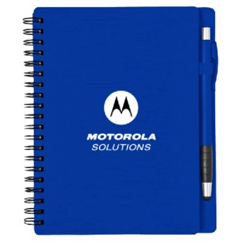 Spiral bound 70-sheet lined notebook with solid metallic textured cover and matching elastic pen strap. Includes matching economy ballpoint pen with capacitive touch stylus.Imprinted with the Motorola Solutions logo.