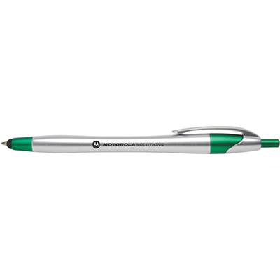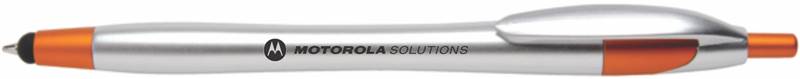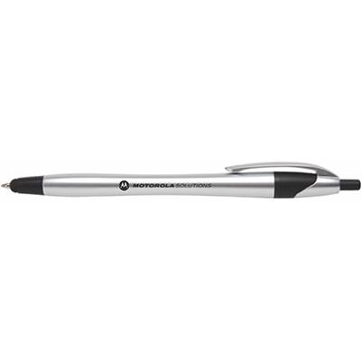 This metallic look pen features a retracting ultra-smooth writing blue or black ink pen tip that extends from a capacitive stylus tip. Navigate smartphones, tablets and other touchscreens with more precision and less smudges. A brushed silver barrel in complemented by a metallic jewel tone trim. Features the Motorola Solutions logo.