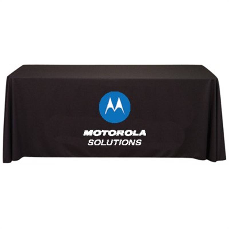 Single piece of fabric (no seam). Covers four sides of an 8 ft. standard table. Premium quality polyester table cover that is washable, flame resistant and easy to store and ship. Features include rolled hem and rounded corners. Table throw drapes four sides of 29" high tables. Fits Table Size: 96" (w) x 29" (h) x 30" (d). Black with the Motorola logo in blue and white.