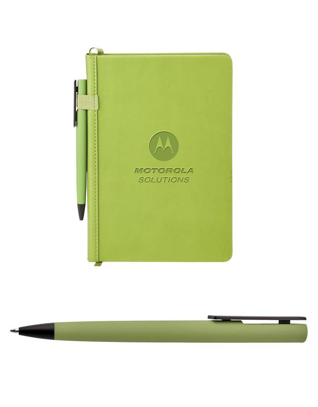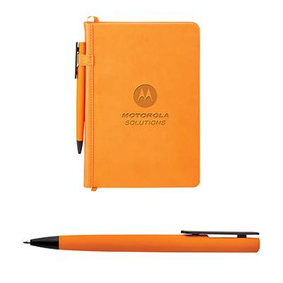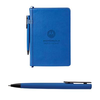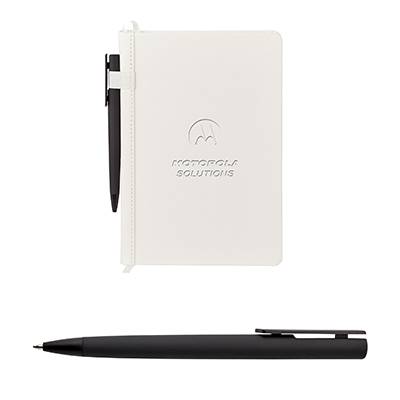 5 3/4" x 8 1/4" Vinyl journal with 192 ivory lined, perforated pages (non-refillable) and a matching clip-action ballpoint plastic pen.