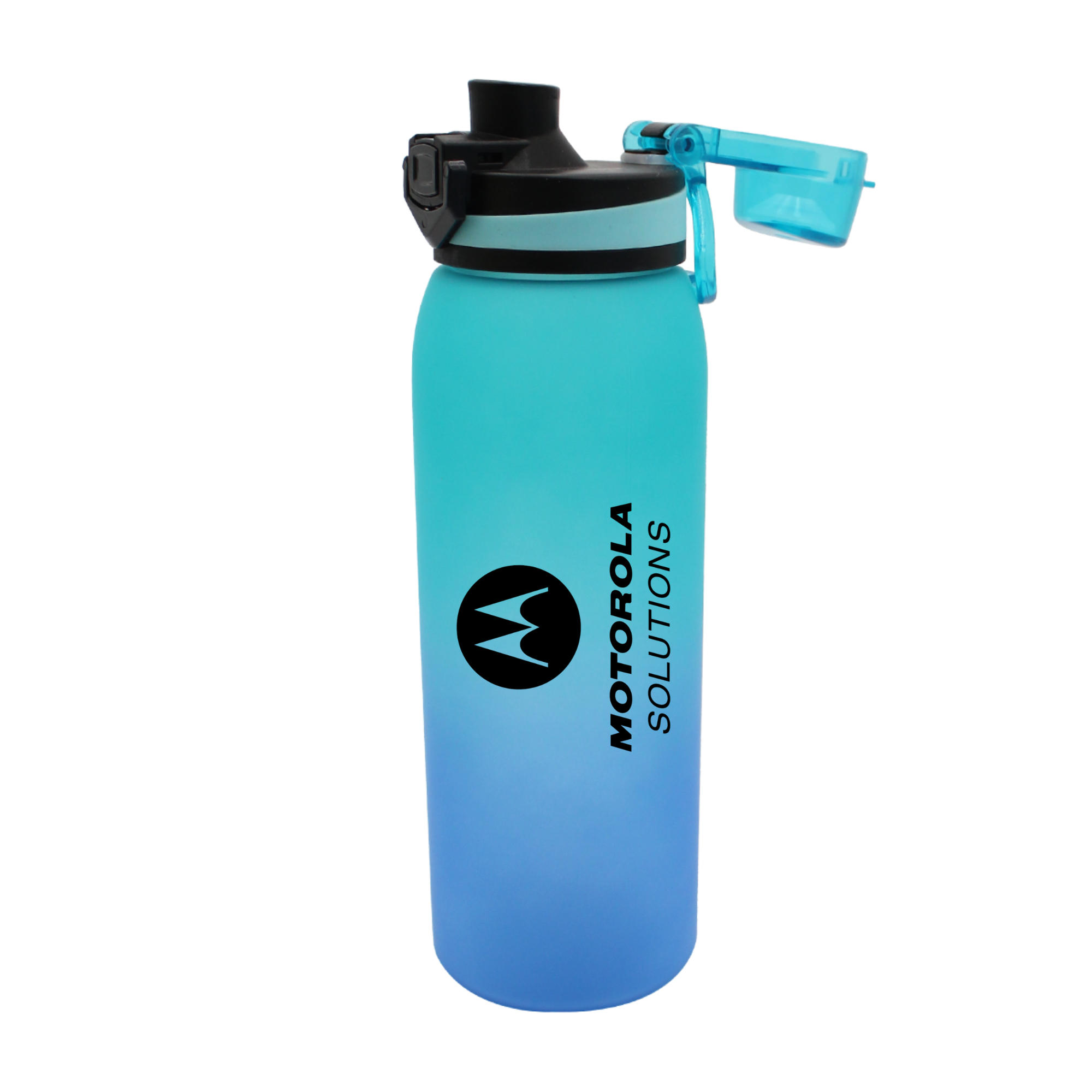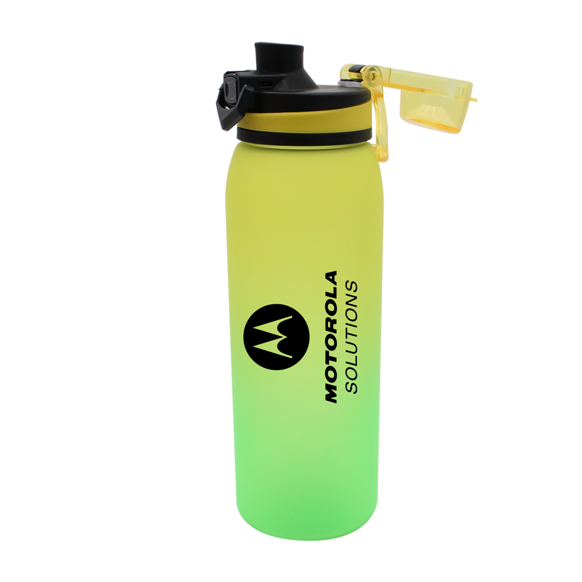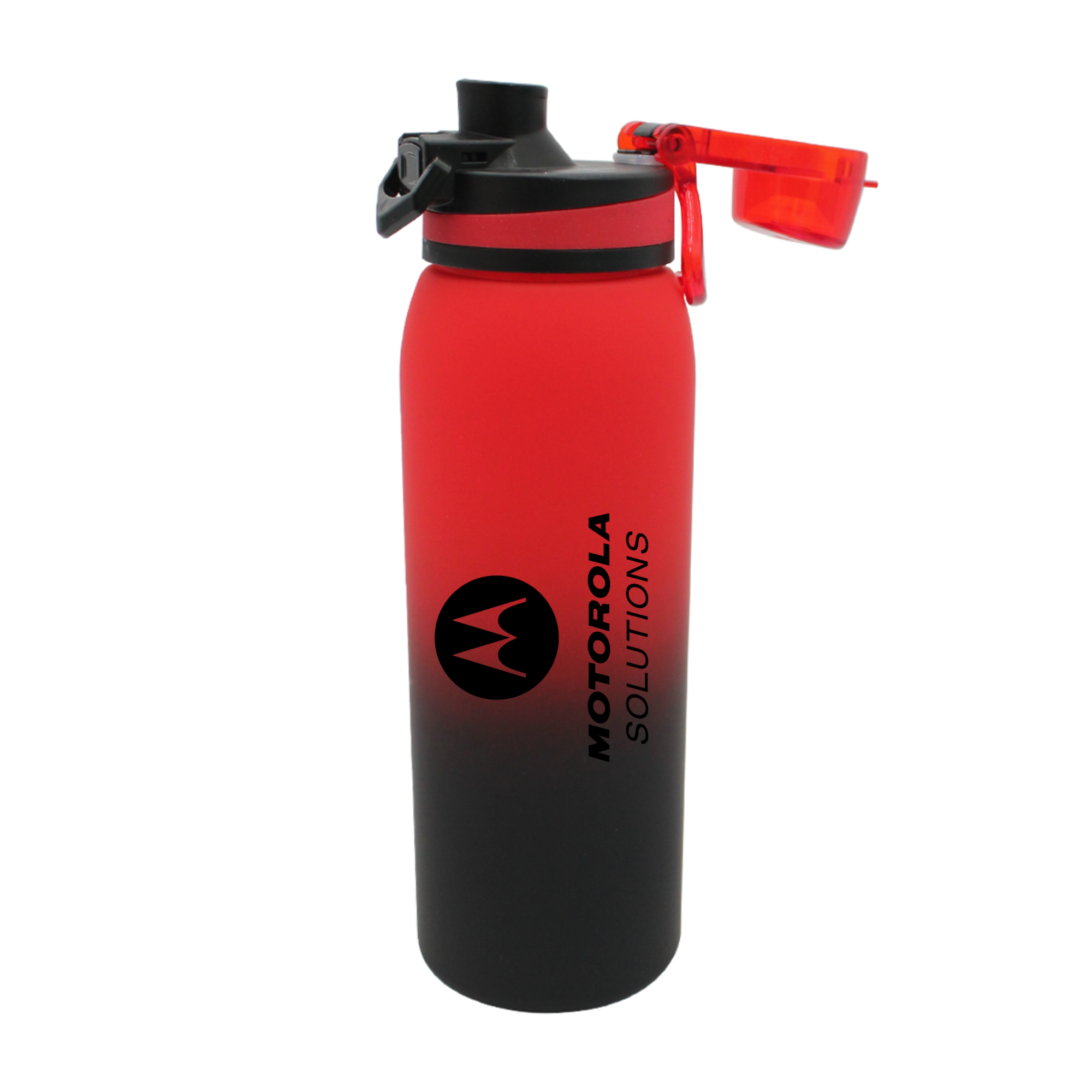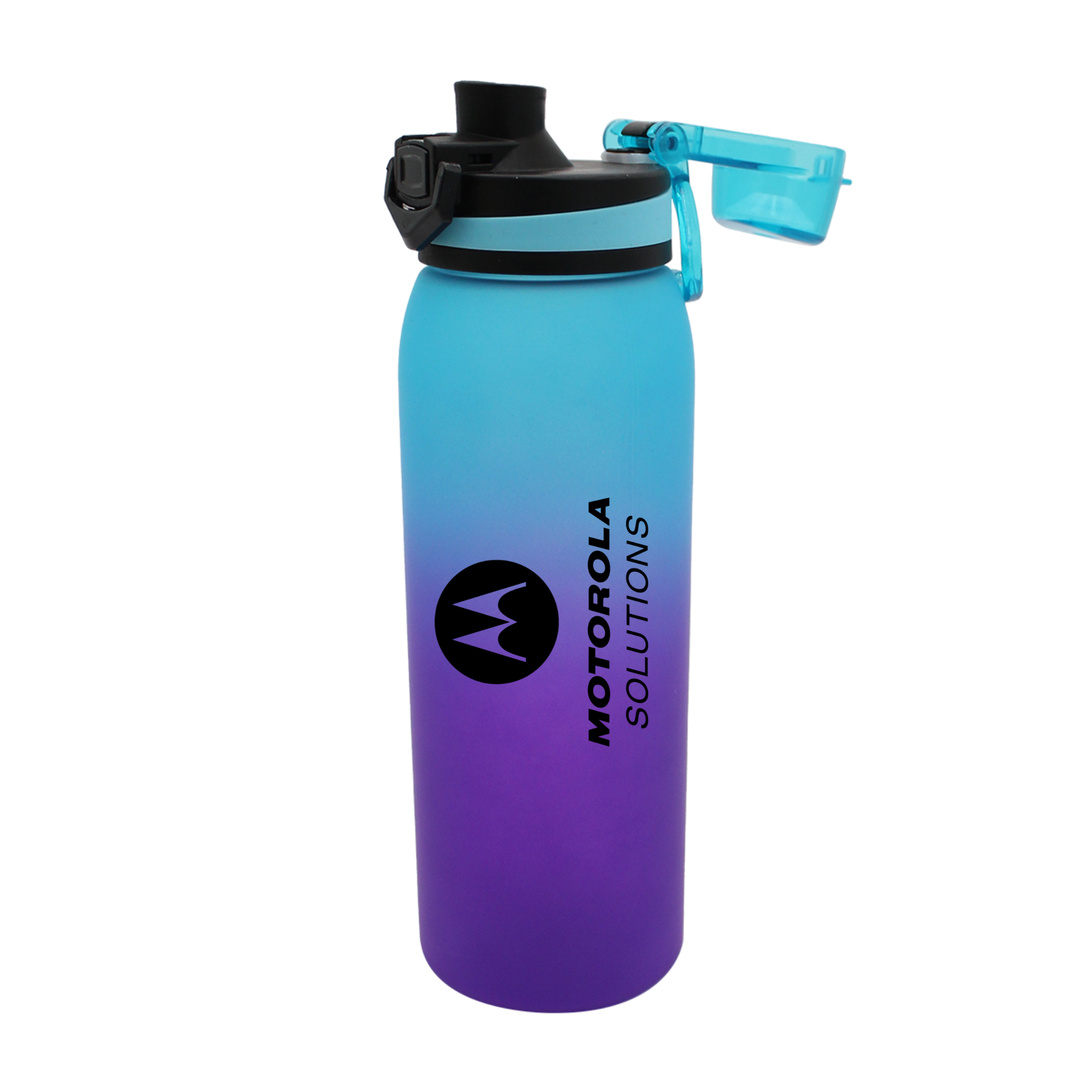 Halcyon soft touch feel coating. Trending ombre style colors fading down bottle. Leak-proof, spout lid features push button open. Convenient finger loop for carrying. Hand wash only. Imprinted with the Motorola Solutions logo.