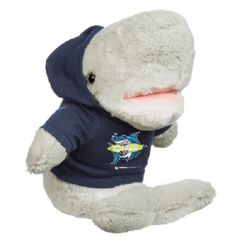 Cute, cuddly shark plushie with hoodie. 6" sitting. Decorated with the Motorola Hackathon logo on the front of the sweatshirt.