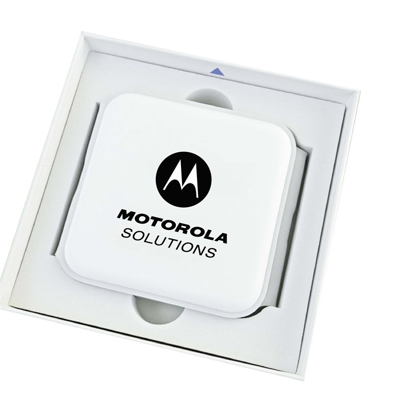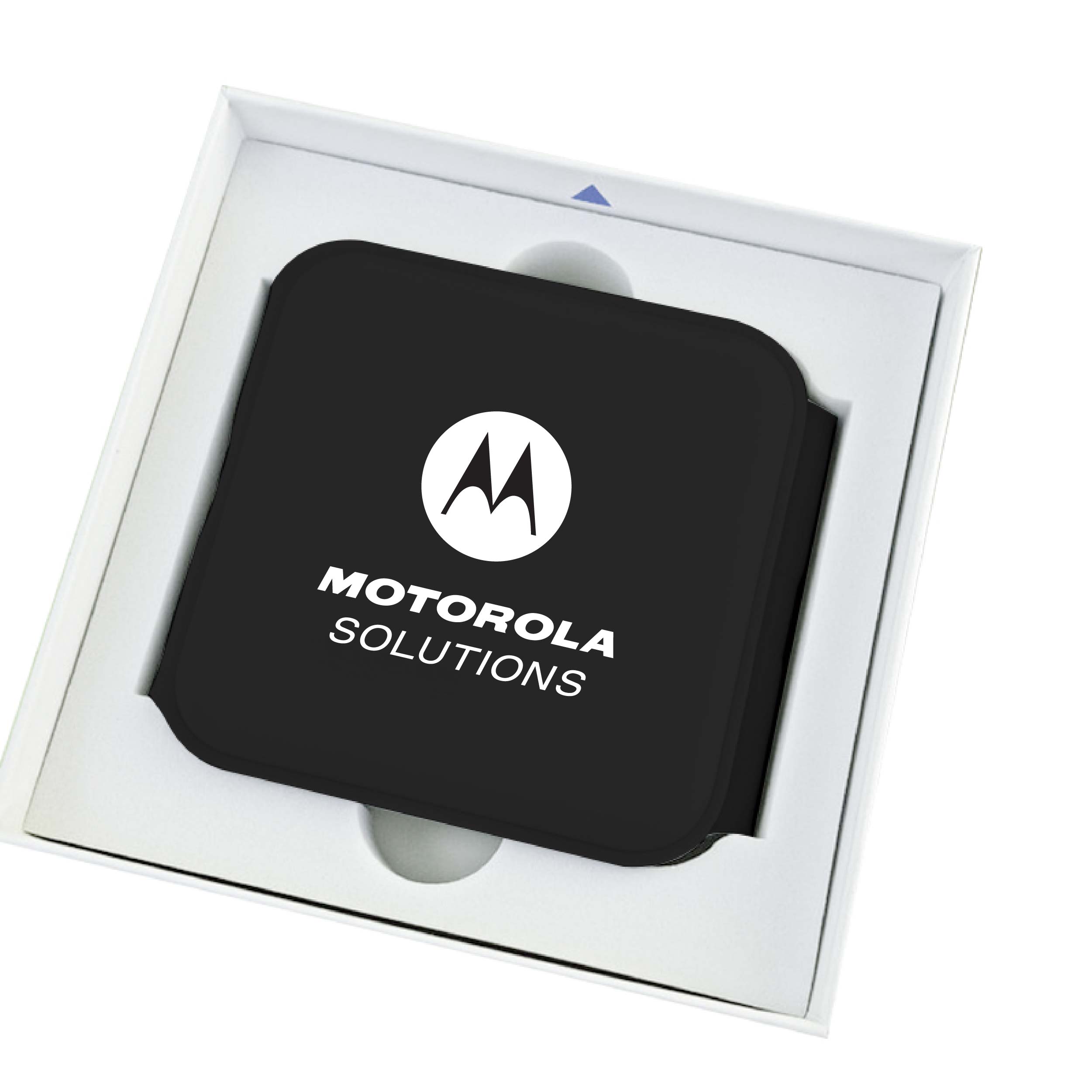 Compact and portable wireless charging mat. Charge your phone, earbuds, and smart watch simultaneously. All Qi enabled devices will charge by placing the device on the top of the mat. Imprinted with the Motorola Solutions Vertical logo.
