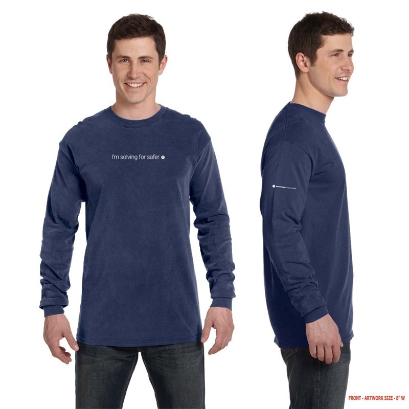 Experience timeless comfort and style with our Comfort Colors Long Sleeve T-Shirt. Crafted from 6.1 oz., 100% ring spun USA cotton, this premium tee features preshrunk, soft-washed, garment-dyed fabric for a lived-in feel right from the start. Sustainably and ethically made, it uses cotton that’s both grown and sewn in the USA, ensuring quality you can trust. Printed with "i'm solving for safer" on the chest and the Motorola Solutions logo on the right sleeve.