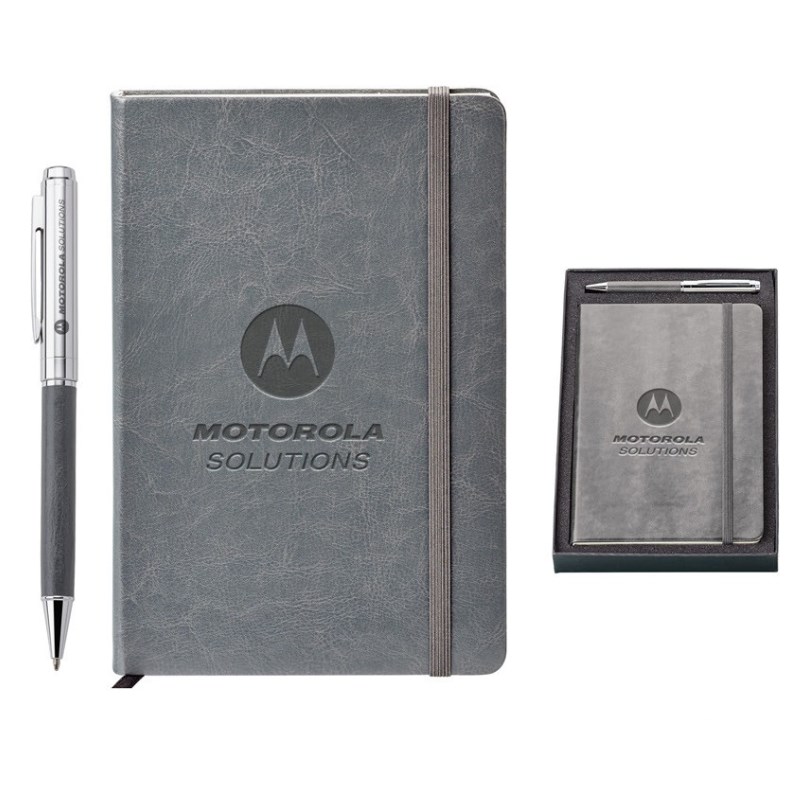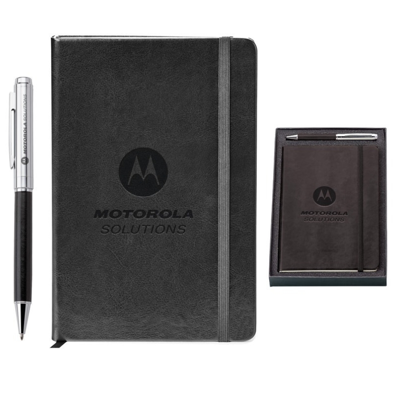 This Executive Gift Bundle features a brass ballpoint pen and a 5.5" x 8.25" vinyl journal (non-refillable). The manual finishing process of the Executive Gift Bundle may cause slight variations in the alignment and thickness of the black edge trim, which is normal and part of its unique design. Each item features the Motorola Solutions Logo.