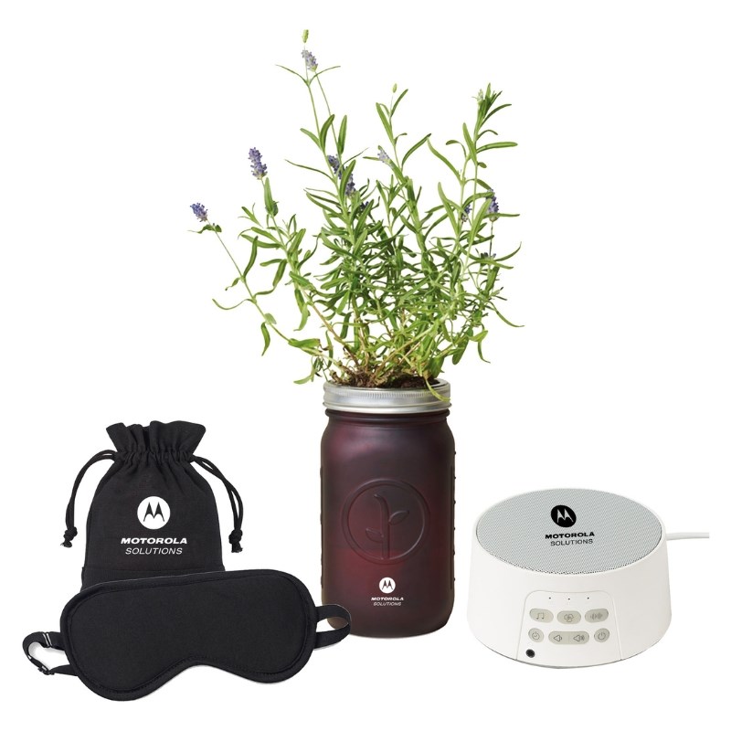 Give the gift of relaxation with this calming gift set, perfect for creating a peaceful atmosphere. It includes a Relax & Restore Blackout Eye Mask for better focus and rest, an R&R Sound Machine with 24 soothing sounds to enhance relaxation, and a Modern Sprout® Lavender Grow Kit to nurture and enjoy. Presented in a recyclable kraft gift box, this thoughtful set promotes calmness and well-being. Includes the Motorola Solutions Logo on the bag, jar, and sound machine.